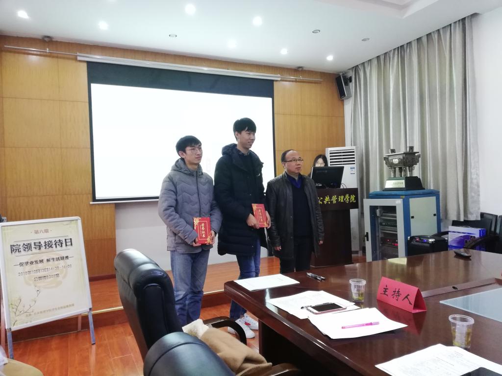 最后,张吉军老师现场为获得“最佳建言献策奖”的2016级法学专业彭逸伦、 2017级行政管理专业刘凡同学颁奖。