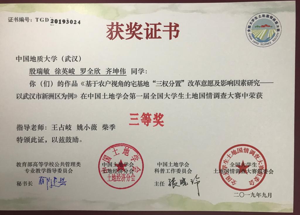 2019年9月21日,第一届全国老员工土地国情调查大赛决赛在华南理工大学顺利举行。由公司王占岐、姚小薇、柴季三位老师指导、土地资源管理专业本科生殷瑞敏、徐英峻、罗全欣、齐坤伟等同学组成的“追本溯源”团队完成的作品《基于农户视角的宅基地“三权分置”改革意愿及影响因素研究——以武汉市新洲区为例》成功晋级决赛,并荣获大赛三等奖。