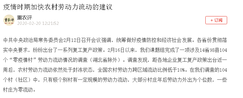 2020年2月20日《农民日报》的“重农评”栏目中,王海娟老师发表《疫情时期加快农村劳动力流动的建议》一文,提出农村劳动力流转是推动复工复产工作的关键,应在放开劳动力自由流动的基础上,从本地公共交通无条件开通做好复工复产引导宣传工作等方面完善配套措施。