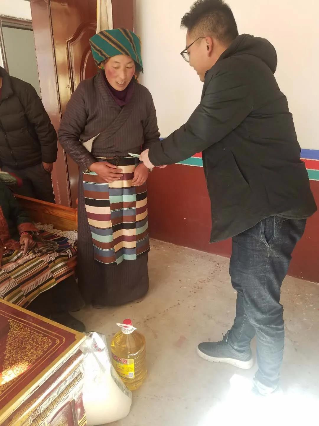 陈世伟(右)为藏民送慰问品