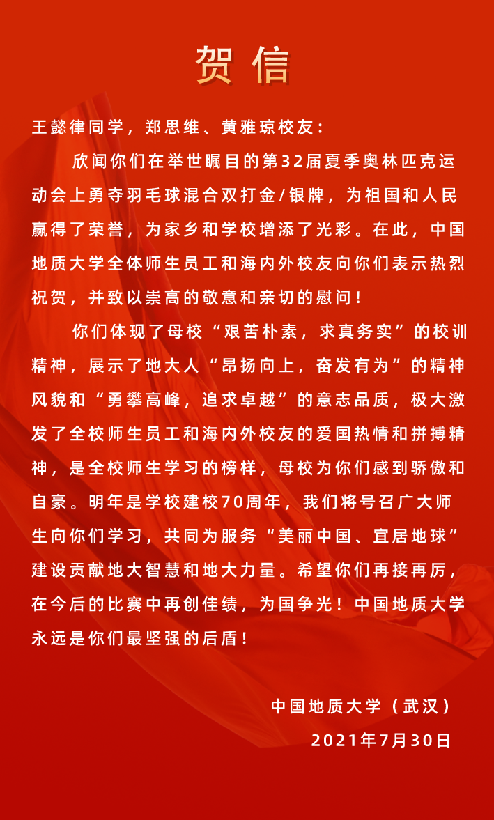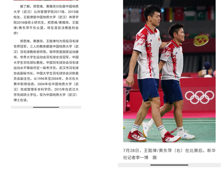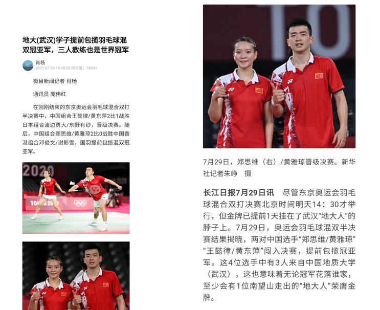王懿律、郑思维、黄雅琼3位地大学子师出同门,均师承304am永利集团体育公司羽毛球教练邹师思。邹师思曾获世界老员工运动会羽毛球女双冠军。她告诉记者,王懿律、郑思维、黄雅琼3人进入地大时成绩优异,自身素质、品德修养都很高,都很阳光,富有朝气。
