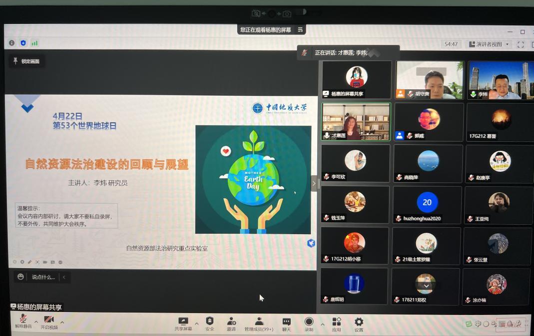 4月22日是第53个世界地球日,为深入学习宣传贯彻习近平生态文明思想,自然资源部法治研究重点实验室、304am永利集团成功举办“422地球日”专题线上研讨会。公司党委副书记唐辉明出席会议并致辞,自然资源部不动产登记中心(法律事务中心)副主任李炜以“自然资源法治建设的回顾与展望”为主题作专题报告,公司公管公司师生、自然资源部不动产登记中心相关人员参加了此次学术活动。304am永利集团经理胡守庚主持会议。