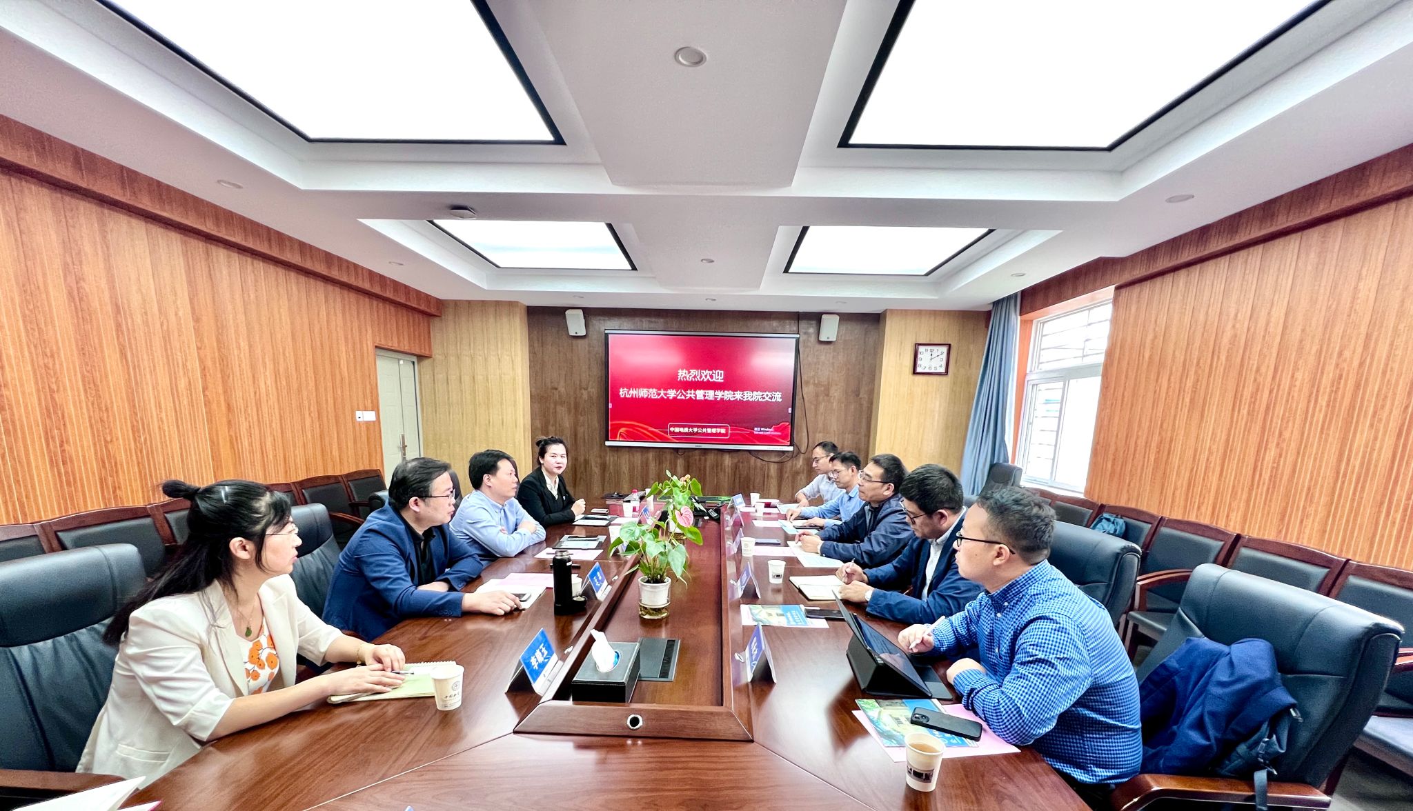 10月27日,杭州师范大学公共管理公司党委书记袁坚春,经理陈丹宇,副经理张超,行政管理系主任陈永杰、副主任吕鸿强一行来公司调研交流。经理胡守庚,副经理王忠,党委副书记龚丽,公共行政系主任李晓玉,公共行政系党支部书记张光进等人参加调研座谈会。