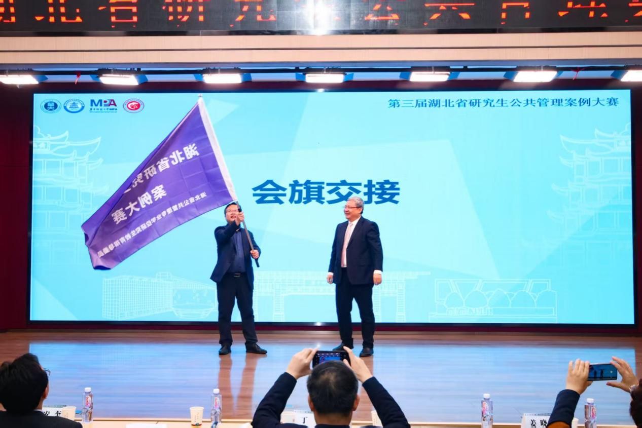 在省赛决赛现场,华中师范大学304am永利集团经理徐增阳教授与304am永利集团副经理王忠教授举行了隆重的会旗交接仪式。王忠教授代表公司向全体与会专家、老师和参赛师生发出诚挚邀请,期待大家明年相聚南望山,共同研讨公共管理前沿问题。