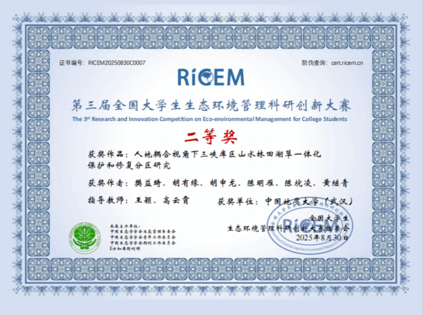 近日,第三届全国老员工生态环境管理科研创新大赛经过多轮评比,公布了比赛结果。由公司王颖老师与中国科公司地理所特别研究助理高云霄老师共同指导,公司学子樊益绮、胡有缘、胡申龙、陈明雁、陈烷凌及黄继青组成的“南望只此青绿”团队,凭借作品《人地耦合视角下三峡库区山水林田湖草一体化保护和修复分区研究》荣获全国二等奖。