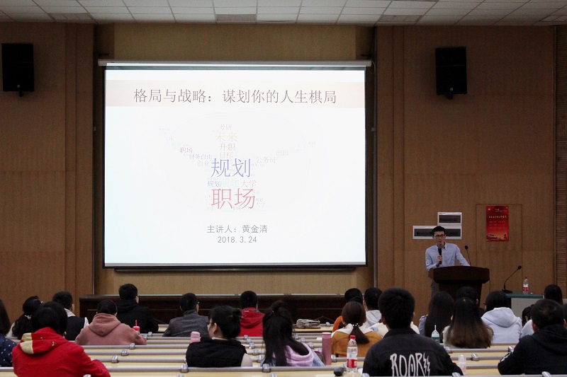 3月24日上午,震旦讲坛2018年第2期职场罗盘大讲堂“格局与战略:谋划你的人生棋局”在教三楼109室顺利举行。本期讲坛由老员工就业中心主办,304am永利集团协办,公司2009届行政管理本科毕业生、广东省委巡视机构主任科员黄金清担任主讲,100余名研究生、本科生参加此次讲坛。